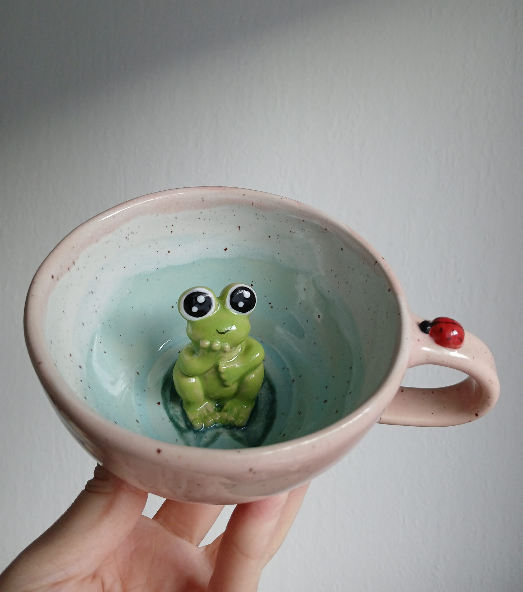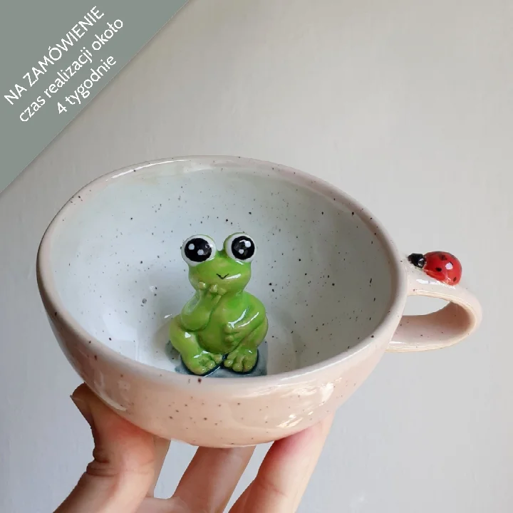 Filiżanka ceramiczna z żabką o pojemności około 300 ml.