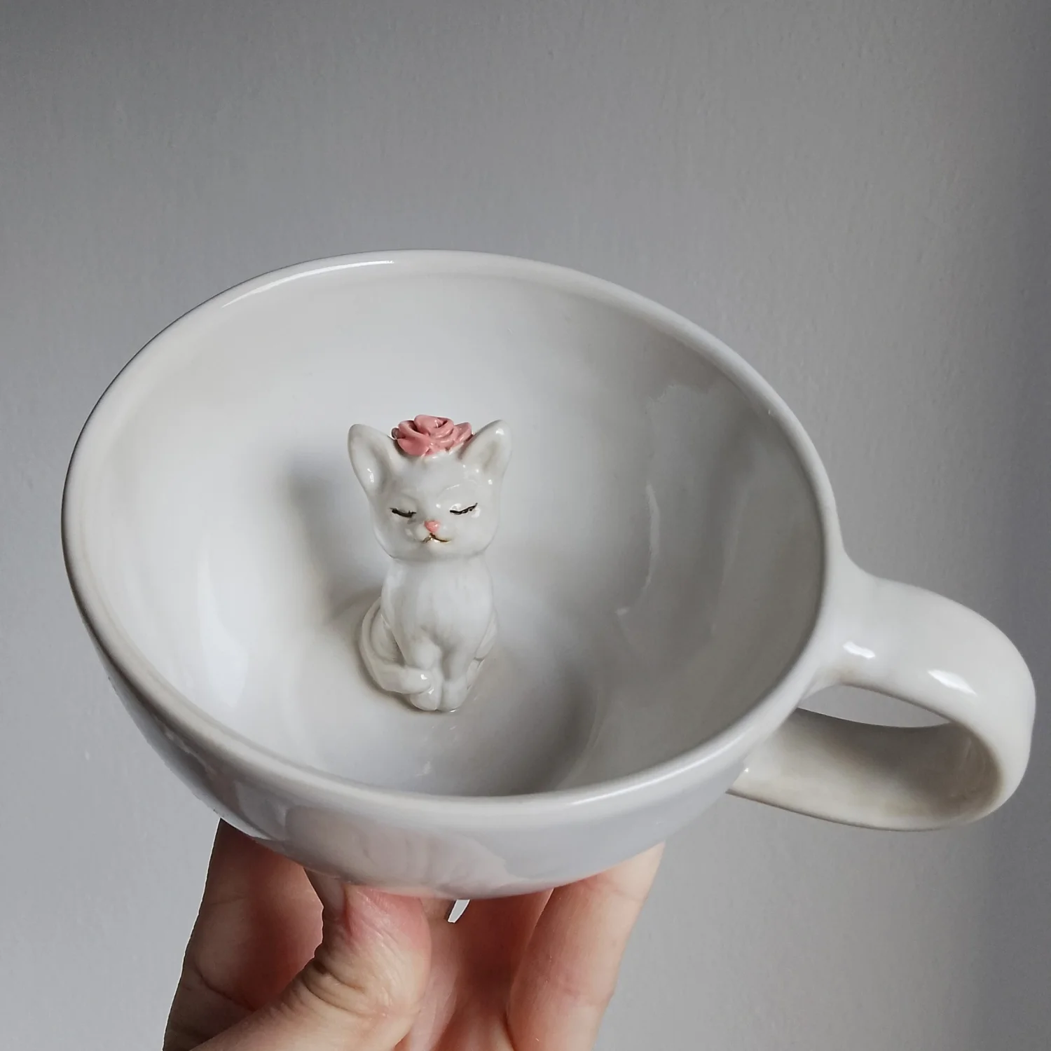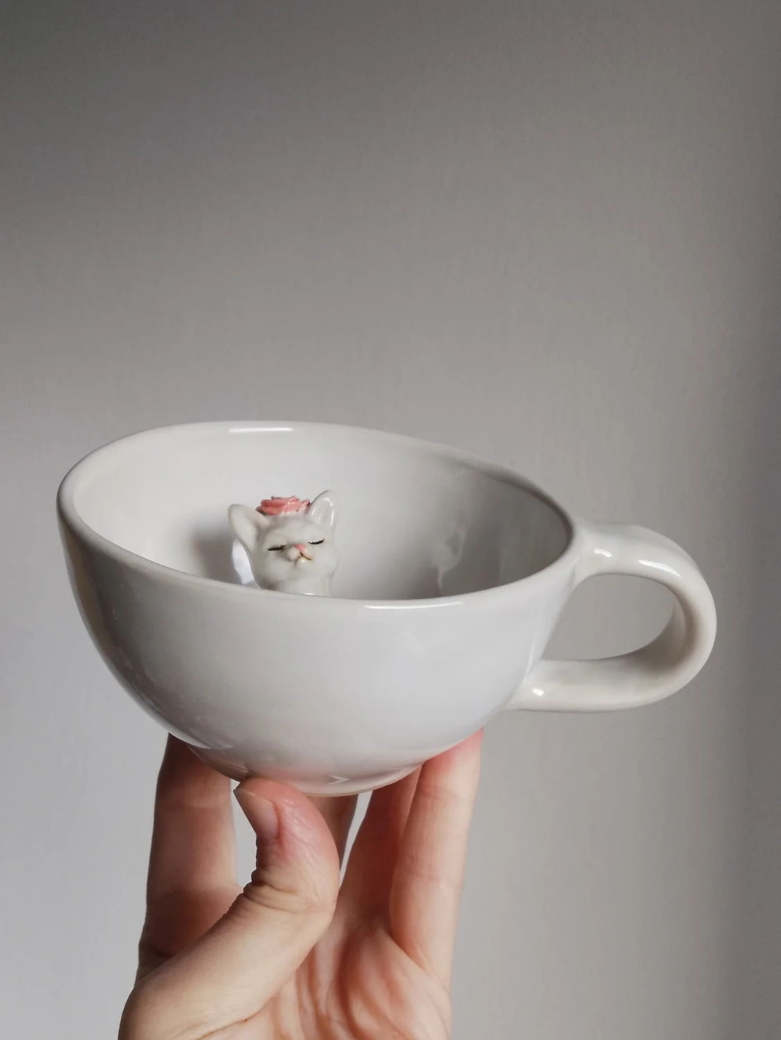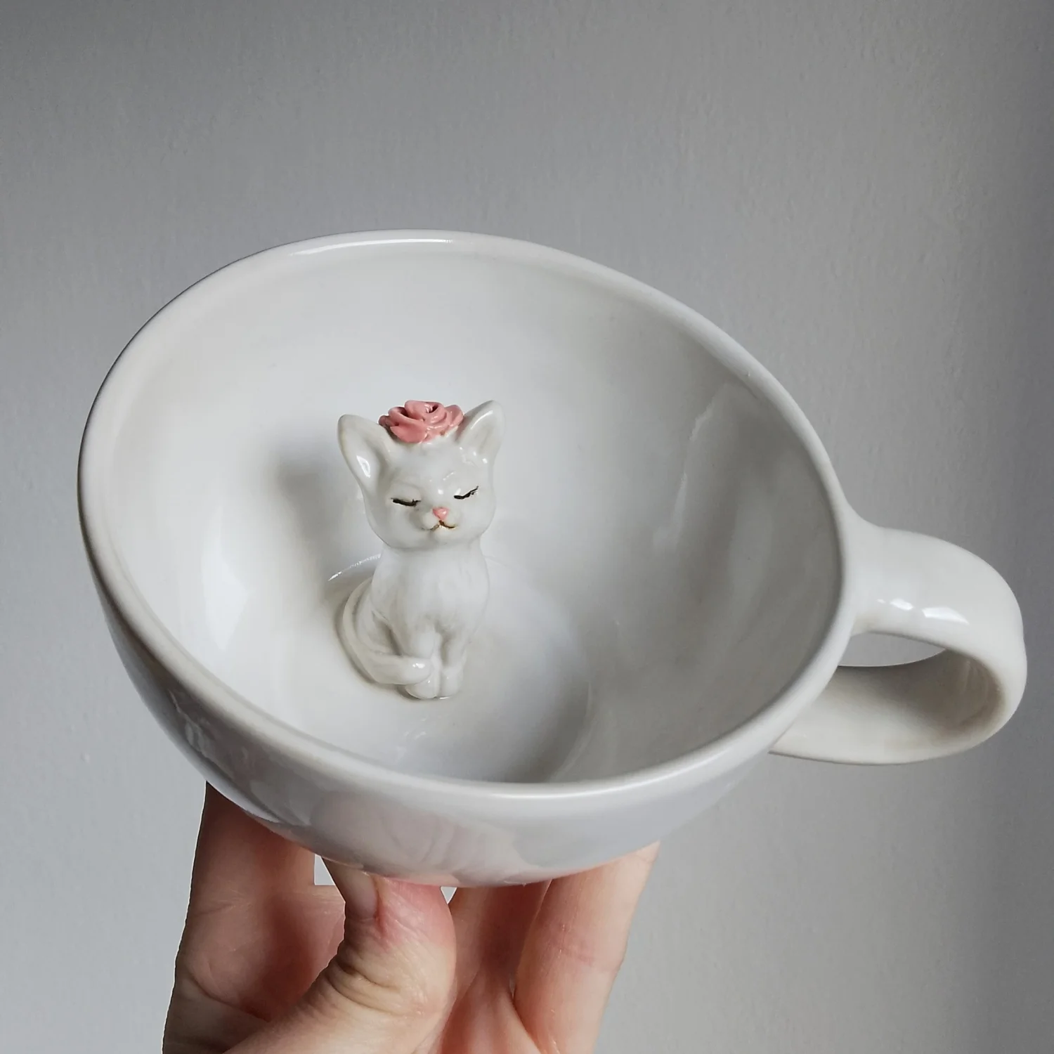 kubek z kotem, filiżanka kot, z kotkiem, ceramika, kubek ręcznie robiony, rękodzieło, biały