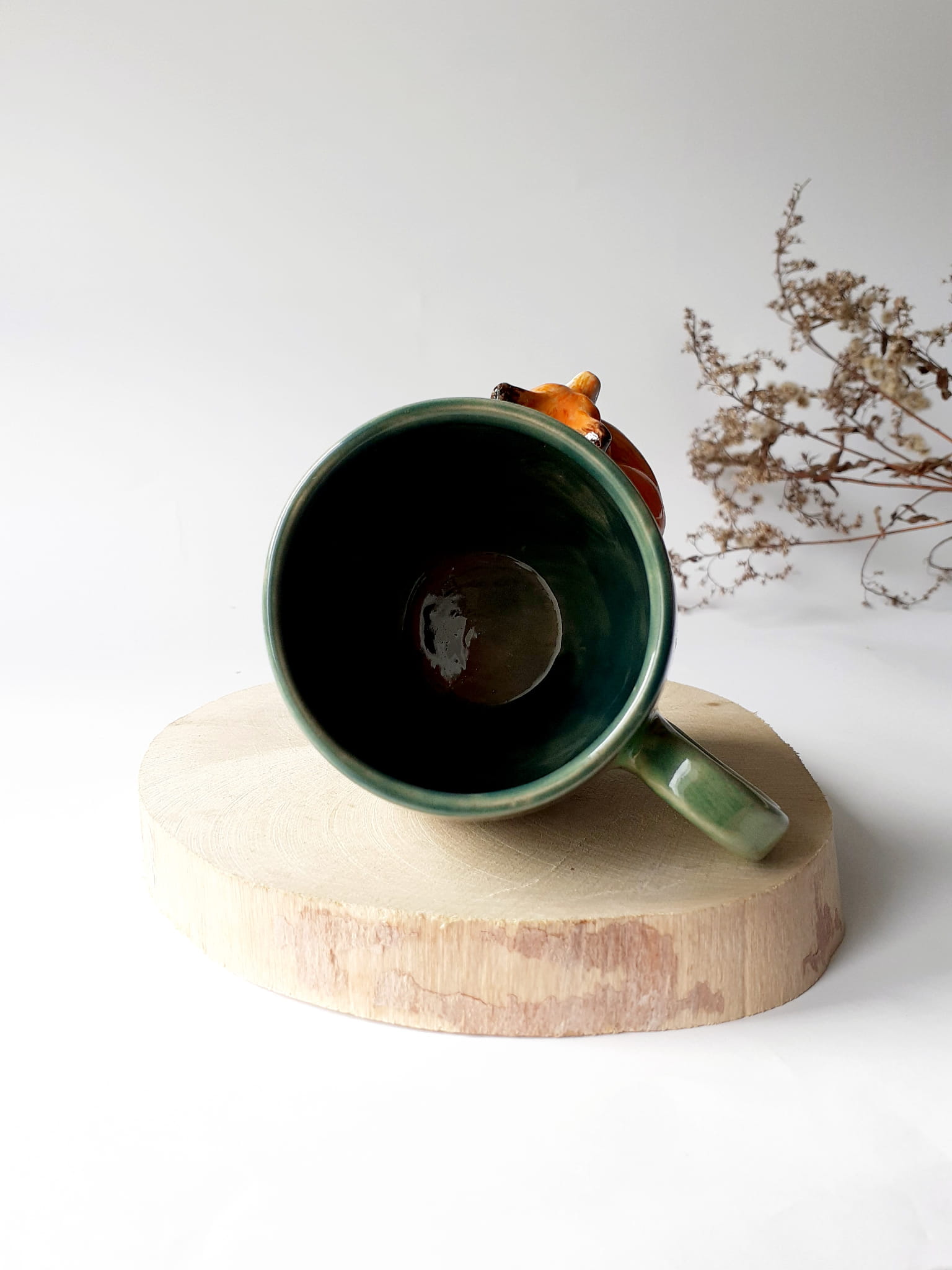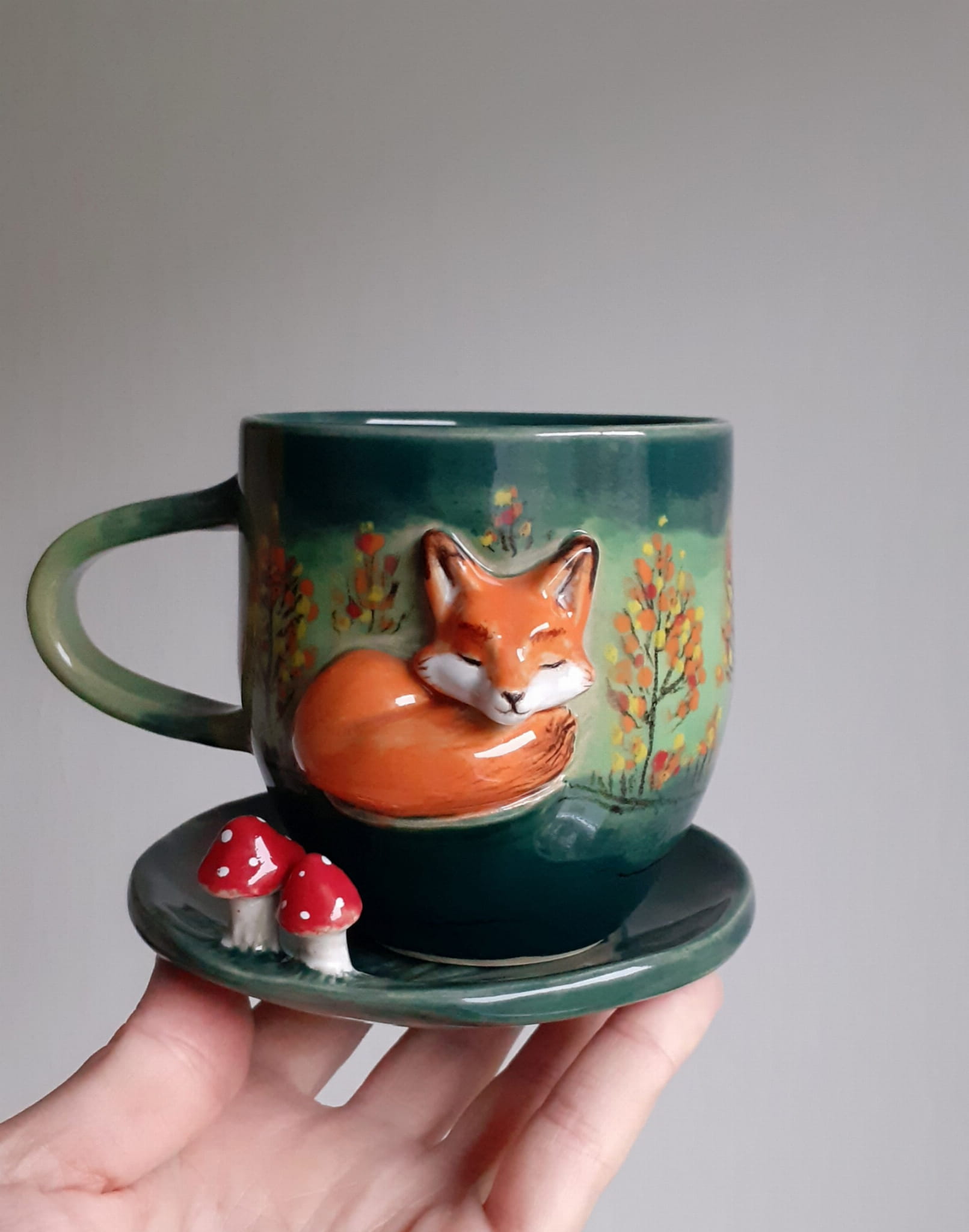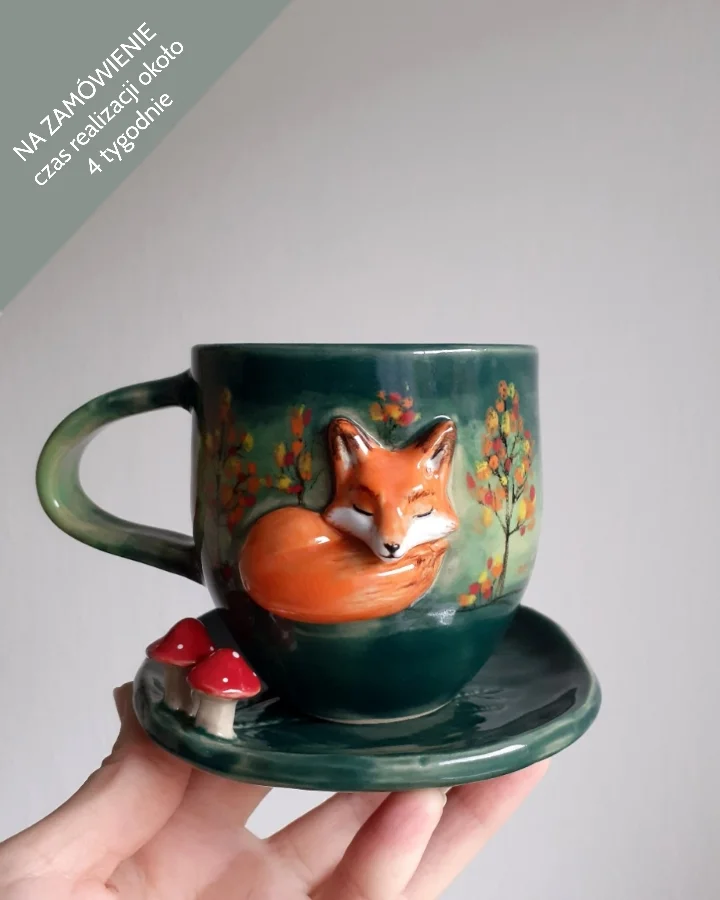 Kubek ceramiczny z liskiem o pojemności około 300 ml plus spodek z muchomorkiem. Wysokość około 9 cm.
