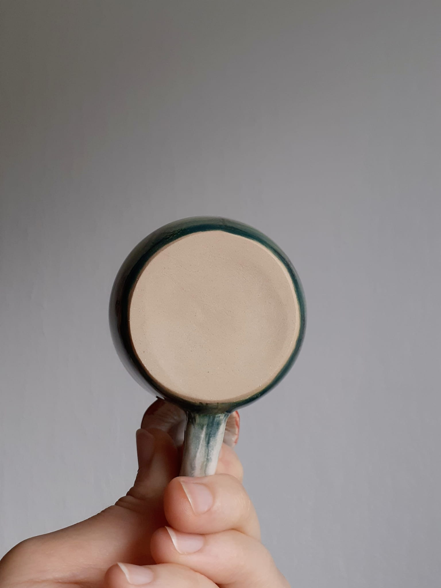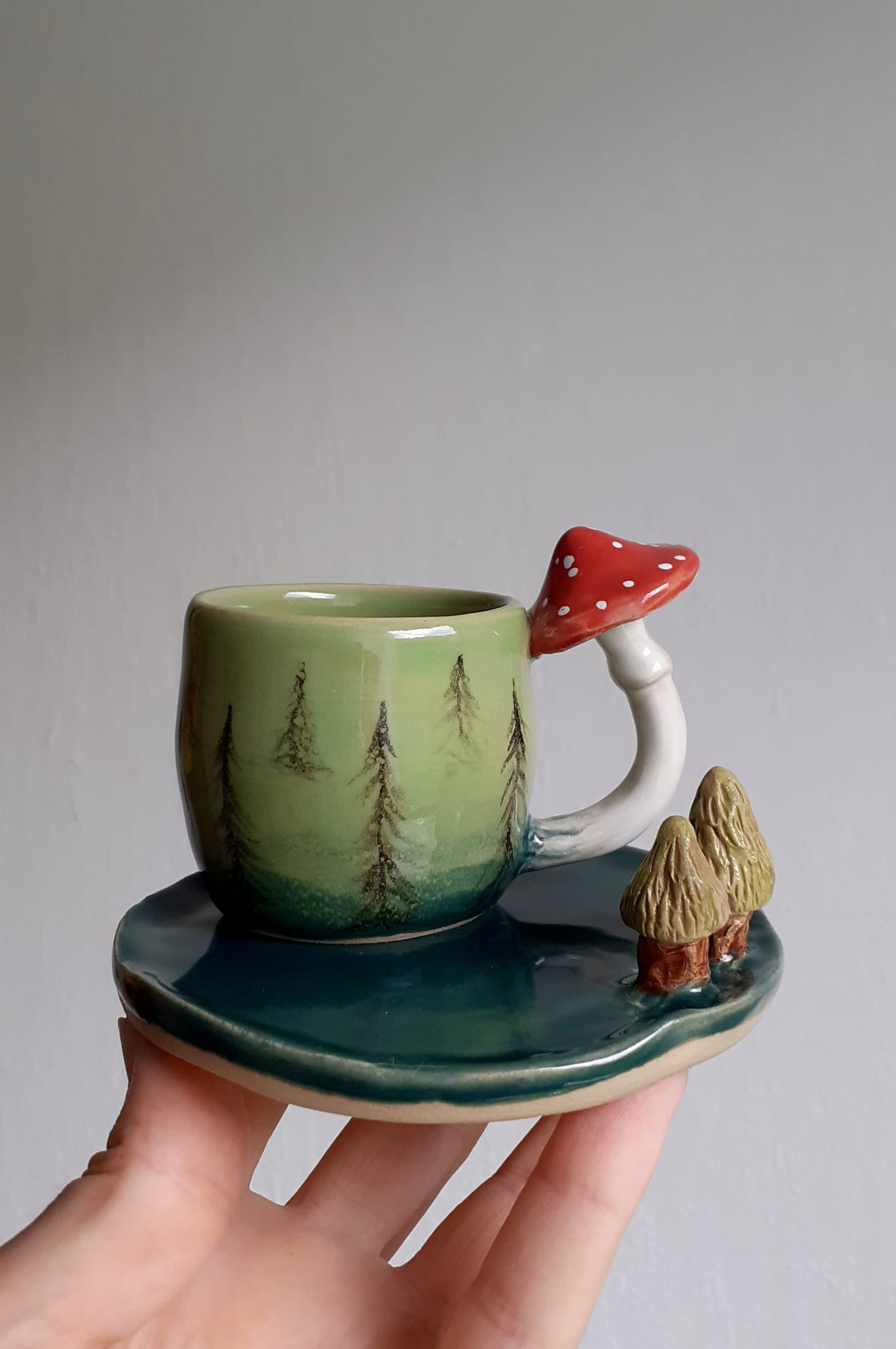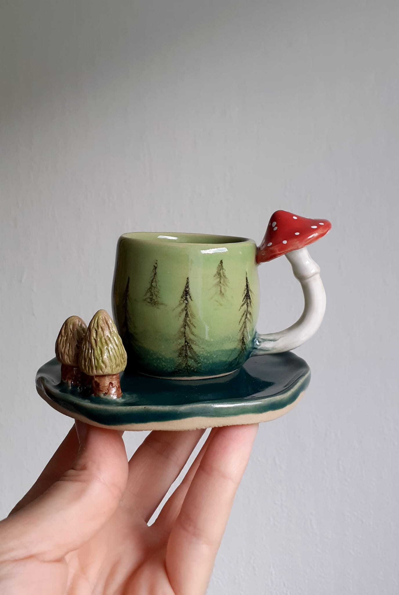 Filiżanka ceramiczna espresso z uchem w kształcie grzybka, plus spodek.